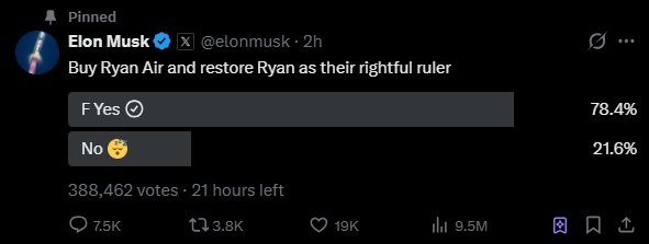 Elon buys Ryanair, rips the wings off the old system, rebrands it into pure 𝕏 energy.